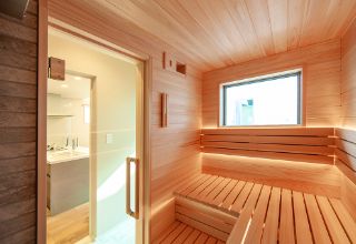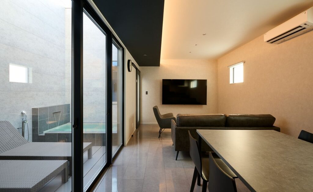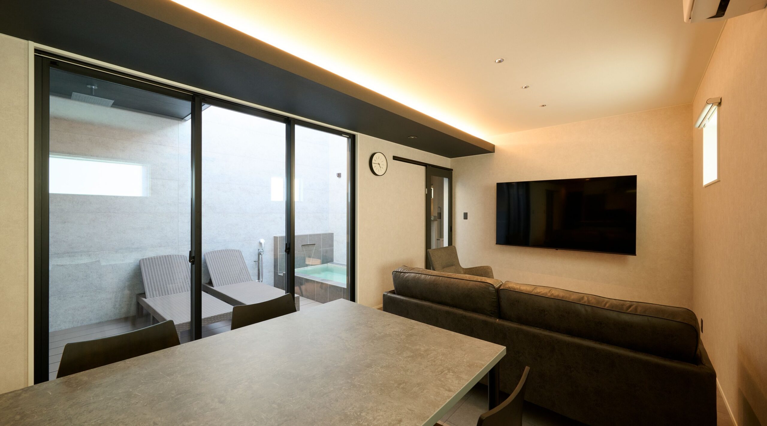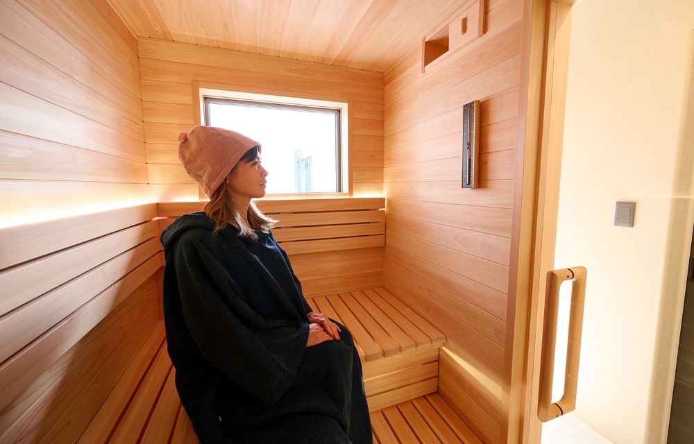 サウナを中心に穏やかな時間が流れ、広々としたリビング空間を備えた客室は