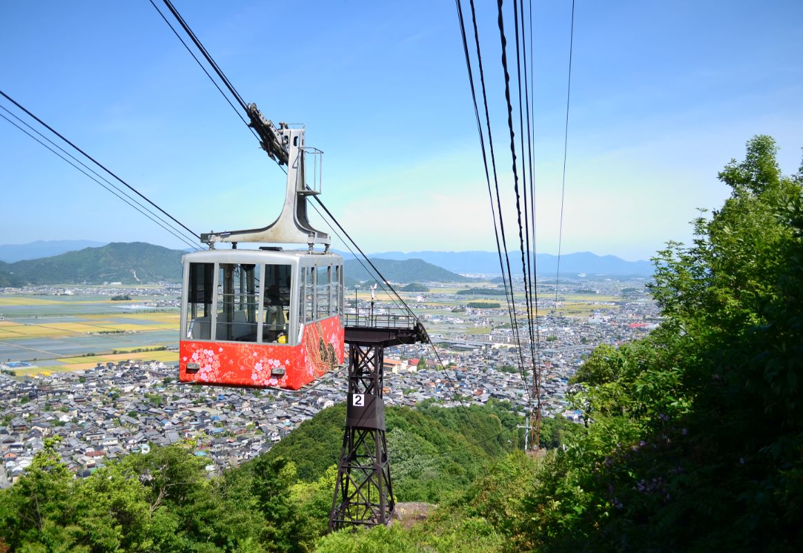 天正13年(1585)に豊臣秀次が築いた八幡山城の城跡。ふもとから山頂までを約4分で結び、琵琶湖や旧城下町が一望できます。