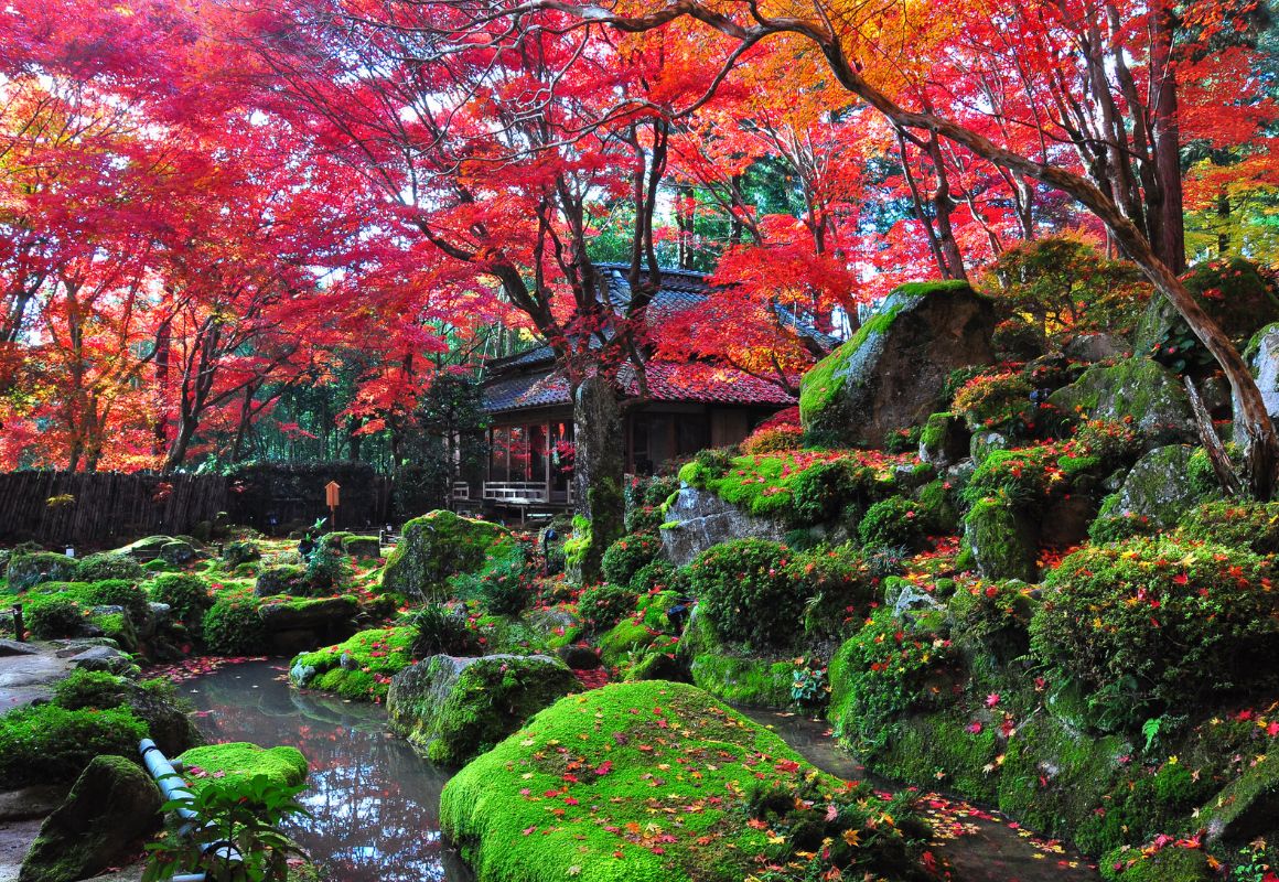 紅葉の名所として名高く、庭園は小堀遠州作と伝わる名勝。平時は非公開で、春・秋の公開と紅葉ライトアップはホームページで確認を。